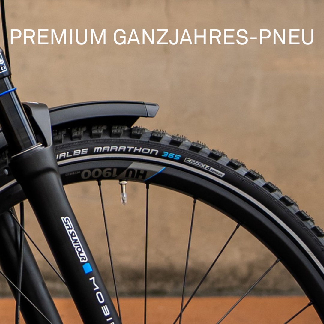 - den premium Ganzjahrespneu "Schwalbe 365" von Schwalbe für guten Halt bei allen Witterungsverhältnissen