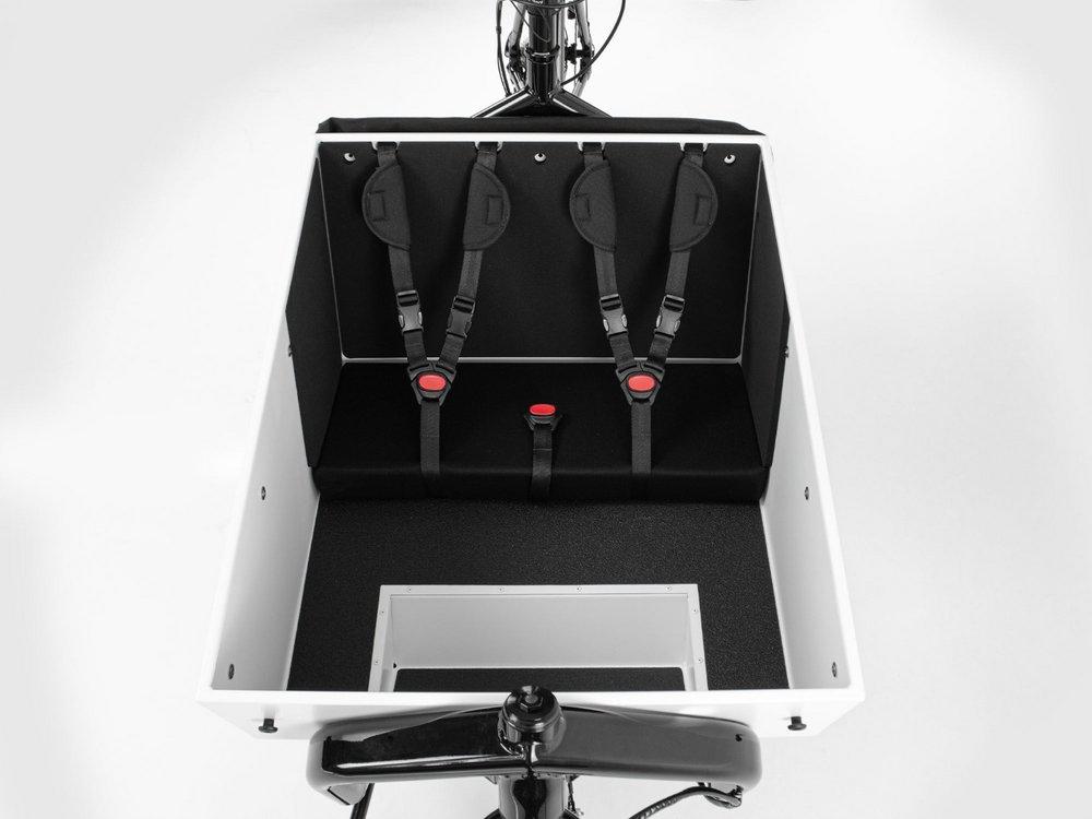 Die EVO Box Kids ist konzipiert für den sicheren Transport von ein oder zwei Kindern plus Einkauf und sonstigem Transportgut. Die Sitz-, Rücken- und Seitenpolster sind herausnehmbar und die Box damit ruck-zuck in eine reine Cargobox und wieder zurück zum komfortablen Kindertransporter umgebaut. Die Fussraumvertiefung und die Antirutschbeschichtung machen es den Kindern sicherer und bequemer und sorgen für eine Stauraumvergrösserung.