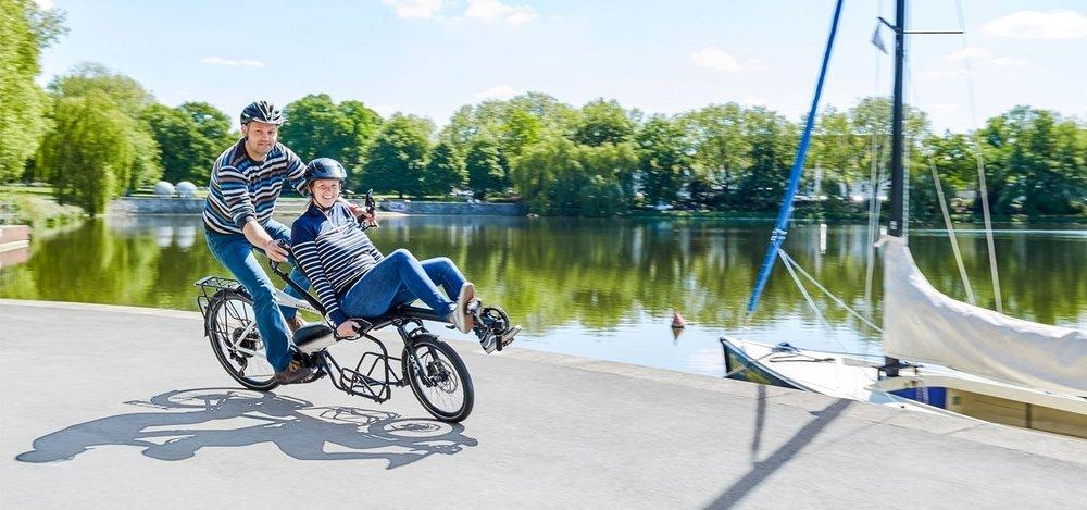 Für noch mehr Fahrspass zu zweit: Einfach und vielseitg vestellbares Tandem von Hasebikes: Da fahren vorne vom Kleinkind über den Teenie, dem frischverliebten Bräutigam bis hin zum Senior alle mit. Mit dem Kräftigen Shimano Steps Motor freut sich das Pino auch über Hügel. Ein prima Velo für alle Lebenslagen