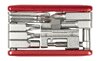 Farbe: redWerkzeug mit 16 Funktionen. Diese sind ein Innensechskant 2/ 3/ 4/ 5/ 6/ 8, ein Rundinnensechskant 25, ein Philips 2, ein Schlitzschraubenzieher, ein Speichenschlüssel 13/ 14/ 15/ 16G und Mavic Spline, ein Kettennieter und ein Flaschenöffner.