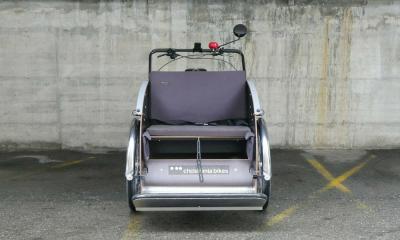 Wir haben die Rikscha von unserer ebenso langjährigen wie geschichtsträchtigen Transportvelo-Manufaktur Christiania in Dänemark soweit modifiziert, dass sie nun auch in der Schweiz für den Transport von zwei erwachsenen Personen zugelassen werden konnte. Dafür brauchte sie bessere Bremsen, eine Standbremse, bessere Bereifung und ausführliche Tests.