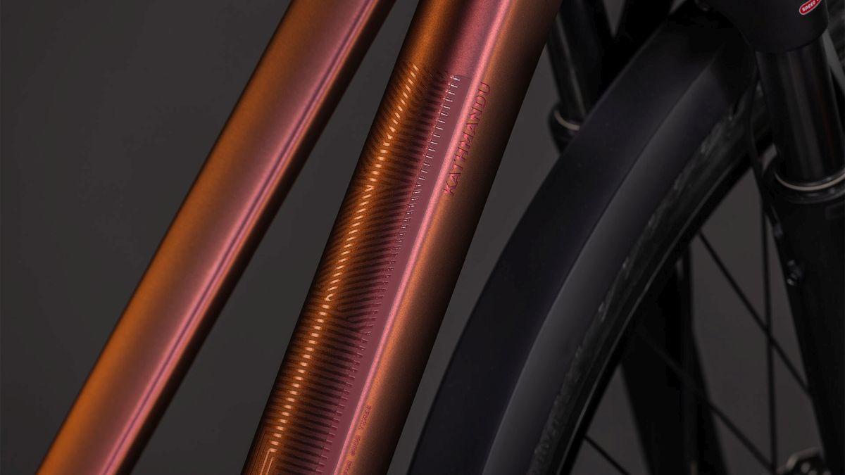 Der Trapezrahmen des Kathmandu aus dem Hause CUBE ist ein Sinnbild für klassische Eleganz! Der integrierte Gepäckträger IC 3.0 geht nahtlos und formschön in unsere ACID Schutzbleche über. Dazu gibt's am Hinterrad Aufnahmen für eine Flat Mount Scheibenbremse und einen Seitenständer. Seine cleane, aufgeräumte Optik verdankt das Chassis den im Smooth Welding Verfahren gestalteten Rohrverbindungen und im Unterrohr verlaufenden Zügen. So viel zum Aussehen. In Sachen Funktion haben wir den Hinterbau mit einer Steckachse versehen und ein konisches Steuerrohr für optimierte Stabilität und Lenkpräzision (selbst bei voller Beladung) verbaut. Also alles da, was es auf Tour braucht – den Rest machst du!
