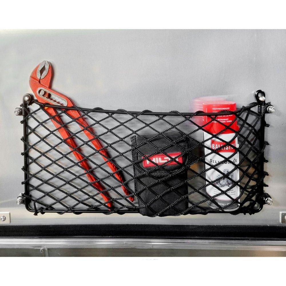 Mit dem Gepäcknetz schaffst Du Ordnung in der großen Alukiste. Die Dinge, die unterwegs schnell zur Hand sein müssen, sind schnell und übersichtlich verstaut. Das Gepäcknetz ist gross genug für Zeitschriften, eine Arbeitsmappe mit Lieferscheinen, Deinen Geldbeutel, Handy, Obst, Handschuhe, eine Mütze und vieles mehr.