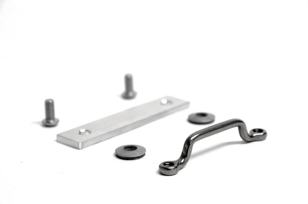 HINTERHER schneidet an jedem Ende der Gurtbandöse ein zusätzliches Innengewinde (M6) rein und liefert dazu eine Gegenplatte mit passenden Bohrungen aus Alu sowie Schrauben und Dichtscheiben aus Edelstahl.