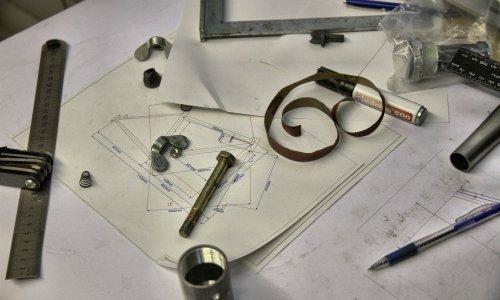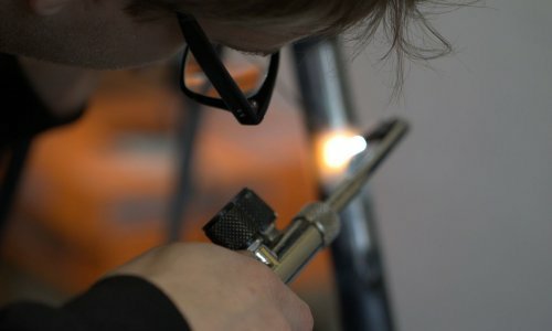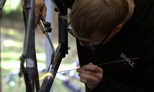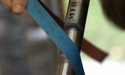 Steff bereitet nicht nur unsere Velociped-Rahmen für das Beschichten und Montieren vor, sondern repariert und modifiziert auch ältere Stahl-Rahmen und macht verbeulte Rohre wieder hüsch.