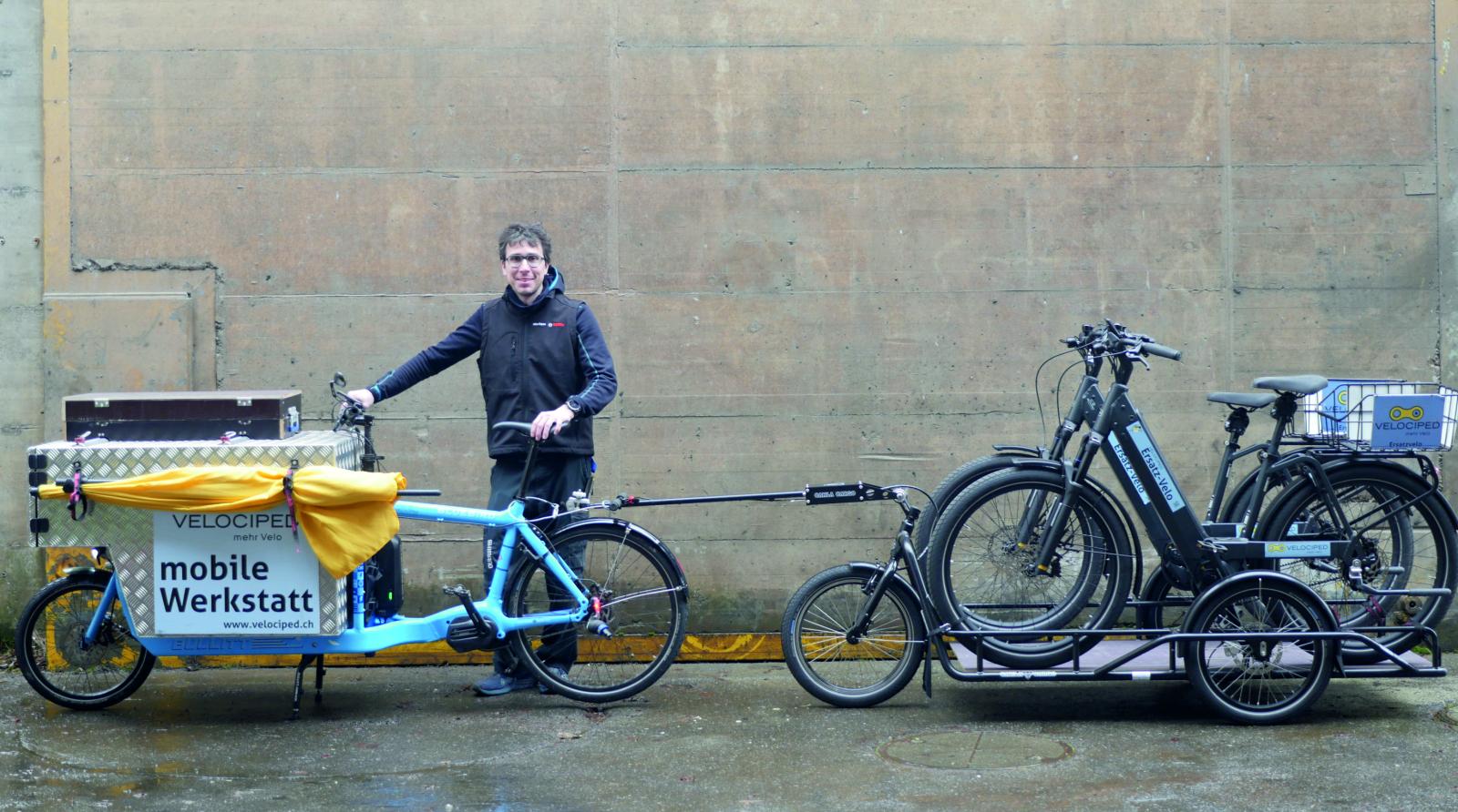 Auf unserer mobilen Velowerkstatt ist alles dabei, was wir für Kleinreparaturen, Services und Sicherheits-Checks unterwegs benötigen: Werkzeuge, Montageständer, Pumpe, Schmier- und Pflegemittel und die gängisten Ersatzteile. Wir haben alles auf unserem Werkstatt-Cargobike untergebracht, so sind wir schnell vor Ort.