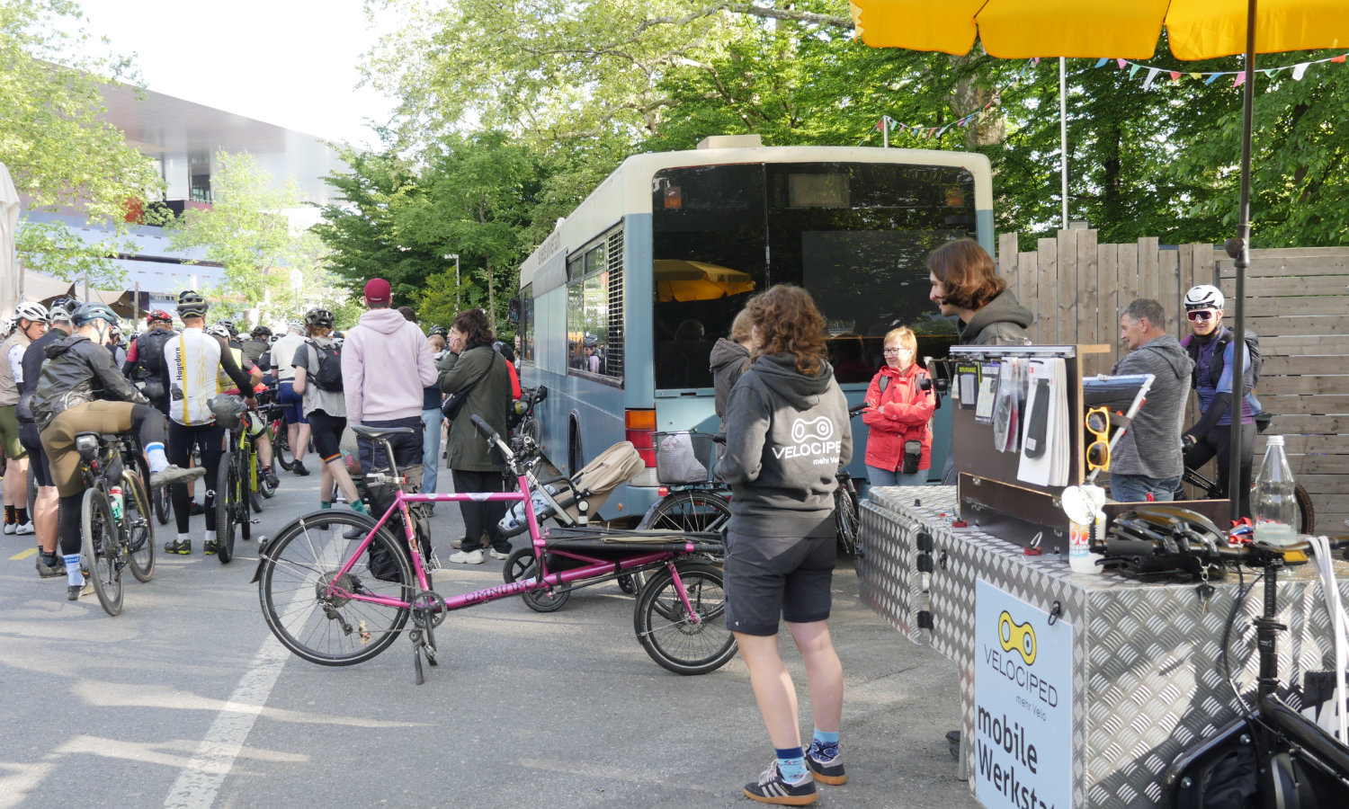 Mit dabei hatten wir auch unsere mobile Werkstatt und machten am Velofest im Auftrag der Stadt Kleinreparaturen, Services und Sicherheitschecks, was von den Besucher:innen gut in Anspruch genommen wurde. So manche Kette quietscht nun nicht mehr, viele Reifen sind nun gut gepumt und die eine oder andere Bremse bremst nun auch wieder besser.