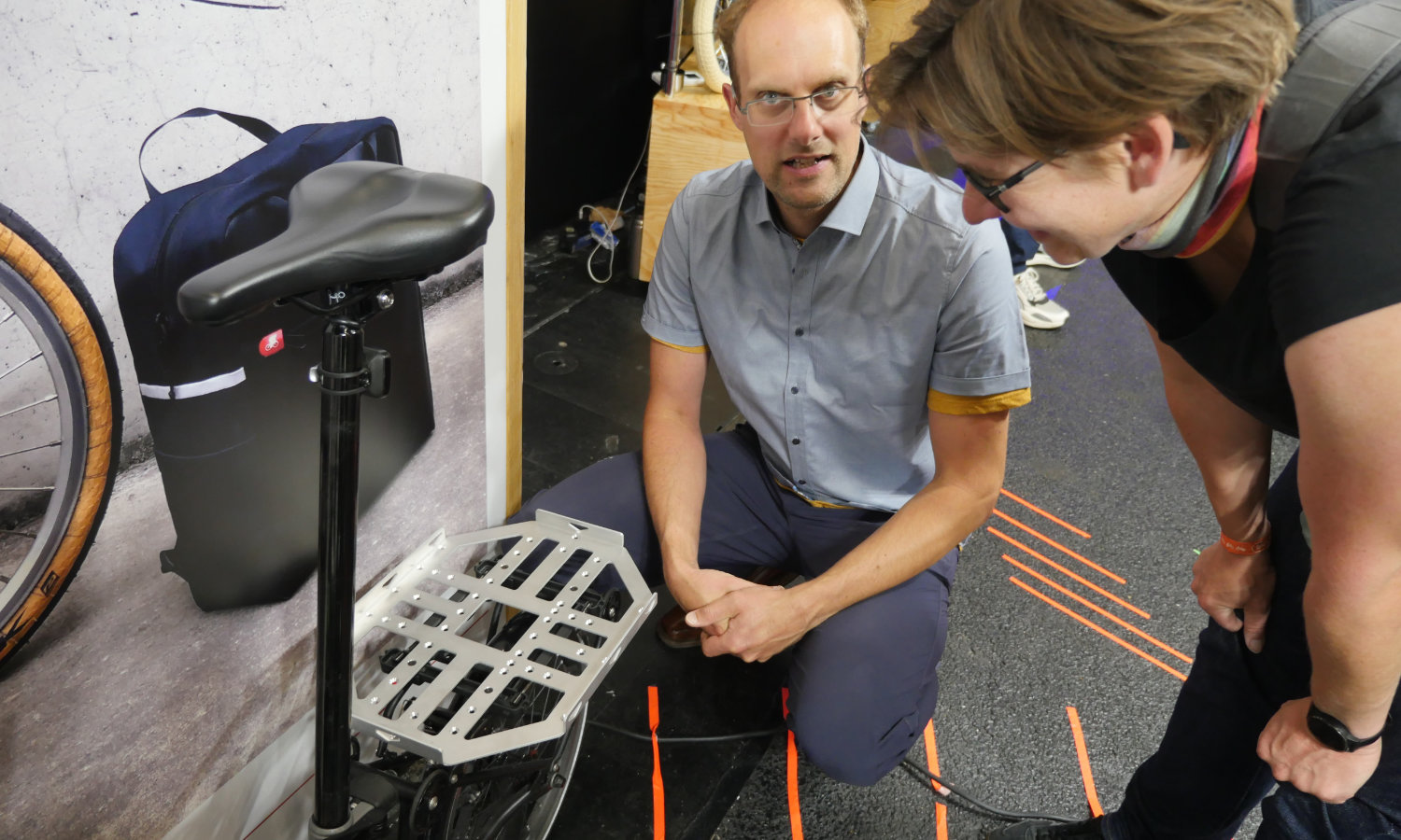 Joachim von Fahrer zeigt Christiane die Gepäckträgerplatte für Euronorm-Kisten.
