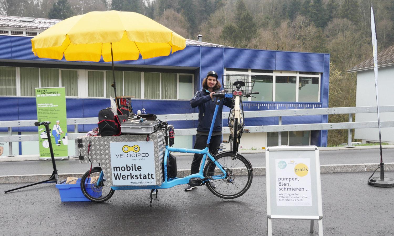 Mit der mobilen Werkstatt bieten wir auch Velochecks und Kleinreparaturen auf Firmengeländen oder bei anderen Events an. Man kann uns ganz einfach dafür buchen.