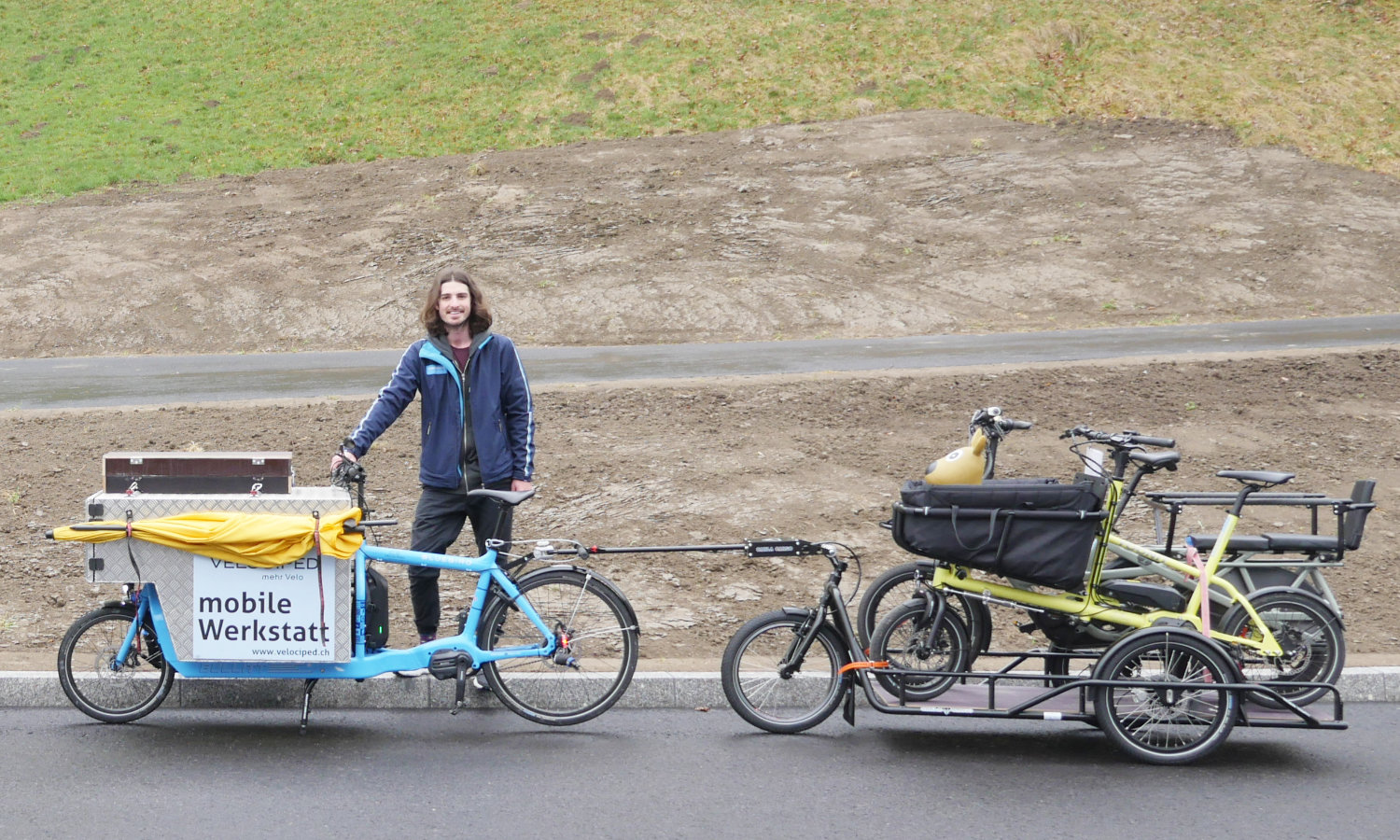 Ein Anhänger für bis zu drei (Ersatz-)Velos ergänzt die mobile Werkstatt