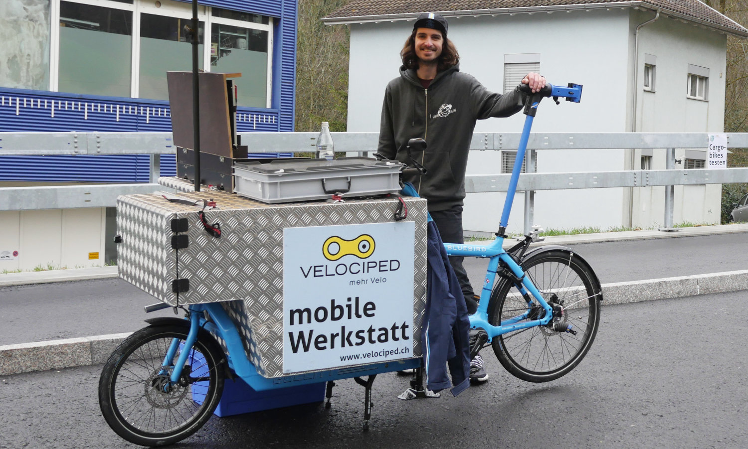Alessio hat sie mit allem nötigen Werkzeug sehr praktisch eingerichtet, sodass bis zu zwei Mechaniker:innen sehr komfortabel daran arbeiten können. Mit dabei sind auch die gängigen Ersatzteile wie Veloschläuche, Lichtkabel, Bremsbeläge sowie Reinigungs- und Pflegemittel, sodass wir Kleinreparaturen "on the road" ausführen können. Und alles hat Platz auf unserem Firmen-Bullitt, alles ist so eingerichtet, dass wir innert kurzer Zeit einsatzbereit sind, wie bei der Feuerwehr.