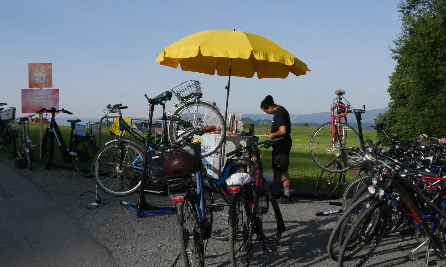 Wir sind mit unserer mobilen Velowerkstatt wieder auf dem Sonnenbergparkplatz und schenken allen Velos, die es bis ganz nach oben geschafft haben etwas Liebe: