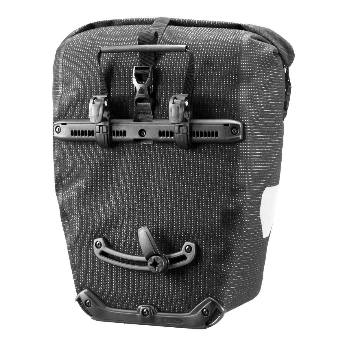 Hinterradtasche (Einzeltasche) mit Rollverschluss, PU-beschichtetes Gewebe mit eingearbeitetem Reflexgarn, inkl. Innentasche, großflächige Reflektoren, Tragegurt. Kombinationsmöglichkeit mit Rack-Pack 24 L und 31 L auf dem Hinterradgepäckträger.