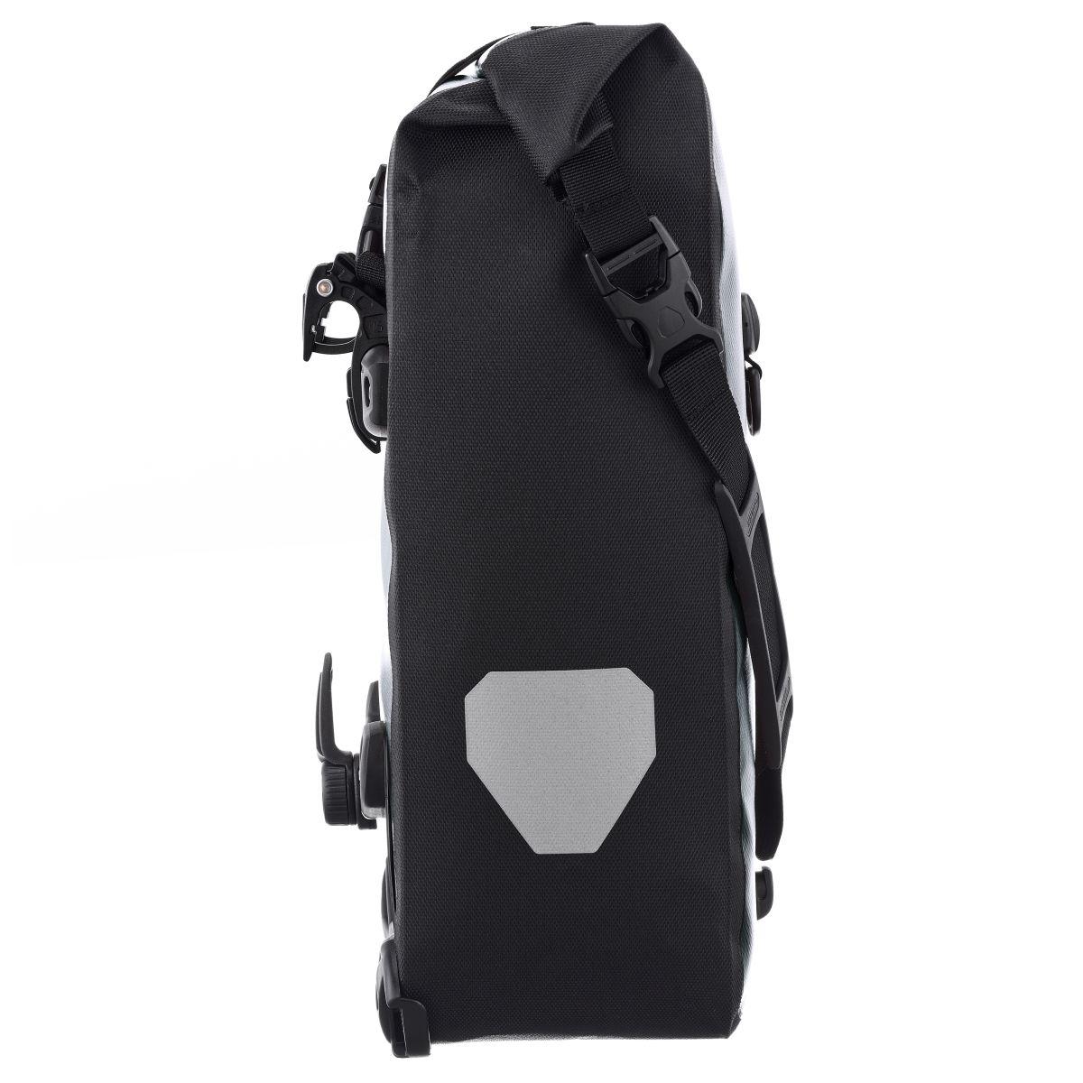Universelle Packtasche (Paar) mit Rollverschluss für Lowrider oder Hinterradgepäckträger (z. B. für Kinderräder); Quick-Lock2.1 System bis 16 mm Gepäckträgerrohr; PVC-beschichtetes Polyestergewebe; inkl. Innentasche; Reflektoren; Tragegurt; Kombinationsmöglichkeit mit Rack-Pack 24 L und 31 L auf dem Hinterradgepäckträger.