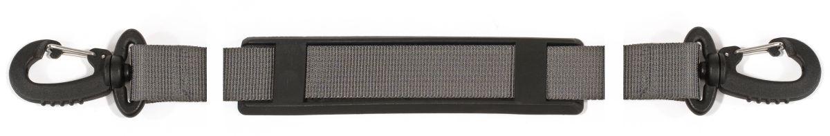 Universeller Tragegurt für ORTLIEB-Taschen mit D-Ringen, mit Schulterpatte aus Kunststoff sowie Karabinern an den Enden.