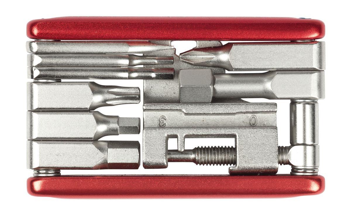 Werkzeug mit 16 Funktionen. Diese sind ein Innensechskant 2/ 3/ 4/ 5/ 6/ 8, ein Rundinnensechskant 25, ein Philips 2, ein Schlitzschraubenzieher, ein Speichenschlüssel 13/ 14/ 15/ 16G und Mavic Spline, ein Kettennieter und ein Flaschenöffner.