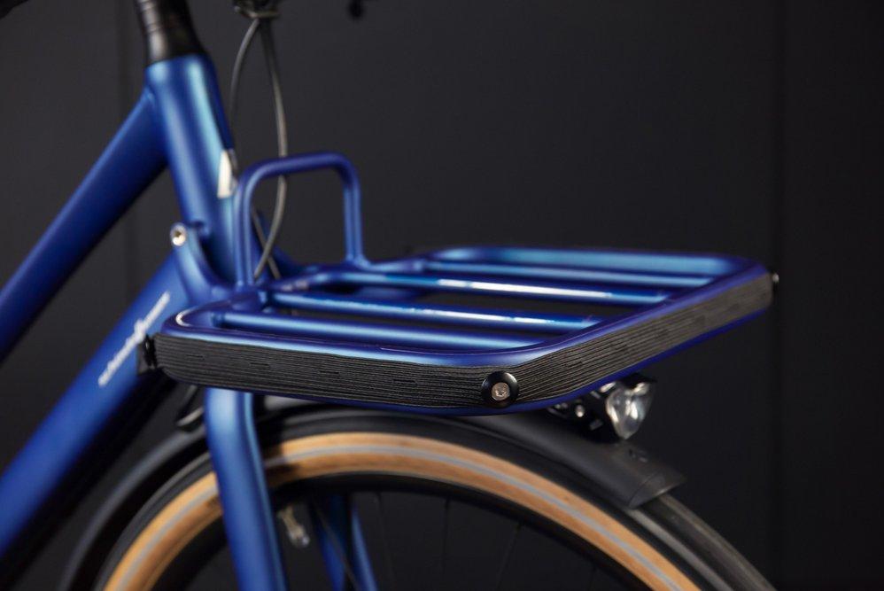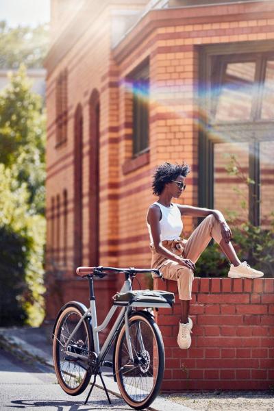 Typisch Schindelhauer bleibt der Anspruch, Funktion mit minimalistischem Design zu verbinden: z. B. durch eine im Schutzblech integrierte Lichtanlage ohne sichtbare Kabelverlegung. Ein weiteres Highlight ist der Frontgepäckträger. Das VarioStrap-System hält die Ladung sicher an seinem Platz und auch schwere Gegenstände haben durch die Verankerung des Trägers am Rahmen keinen Einfluss auf das Fahrverhalten. Greta ist zudem perfekt für die Fahrt mit Kindersitz ausgelegt: Dank des Doppelbein-Ständers kann in Ruhe Kind und Kegel aufgeladen werden.