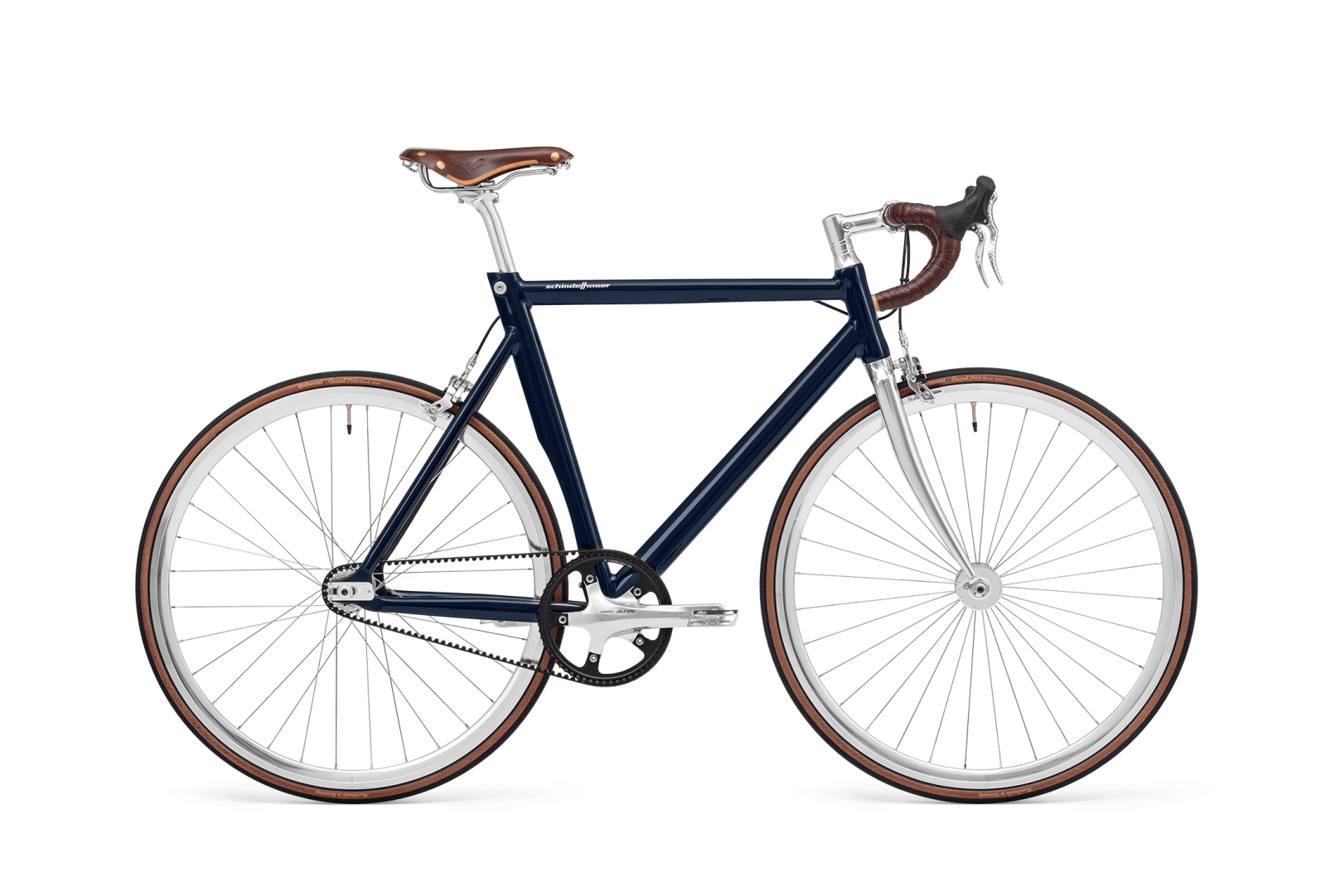 Ausgestattet mit Dropbar und integrierten Bremshebeln ist die Sitzposition aerodynamisch und dank schnelleren Reifen hat man noch mehr Vortrieb. Eine geschwungene Gabel, Lederapplikationen von Brooks und polierte Komponenten repräsentieren den typischen Schindelhauer-Look.