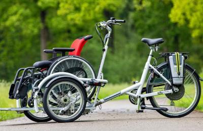 Das Rollstuhl Transportfahrrad hat ein modernes Design mit luxuriöser Verarbeitung, guten Fahrdynamik, und stabileres Fahrverhalten. Die niedrige Position des Rollstuhls auf dem Fahrrad vereinfacht das Auffahren und resultiert in einem niedrigeren Schwerpunkt. Die breit angebrachten und extra mitsteuernden Vorderräder sorgen für einen verkürzten Wendekreis und Stabilität.